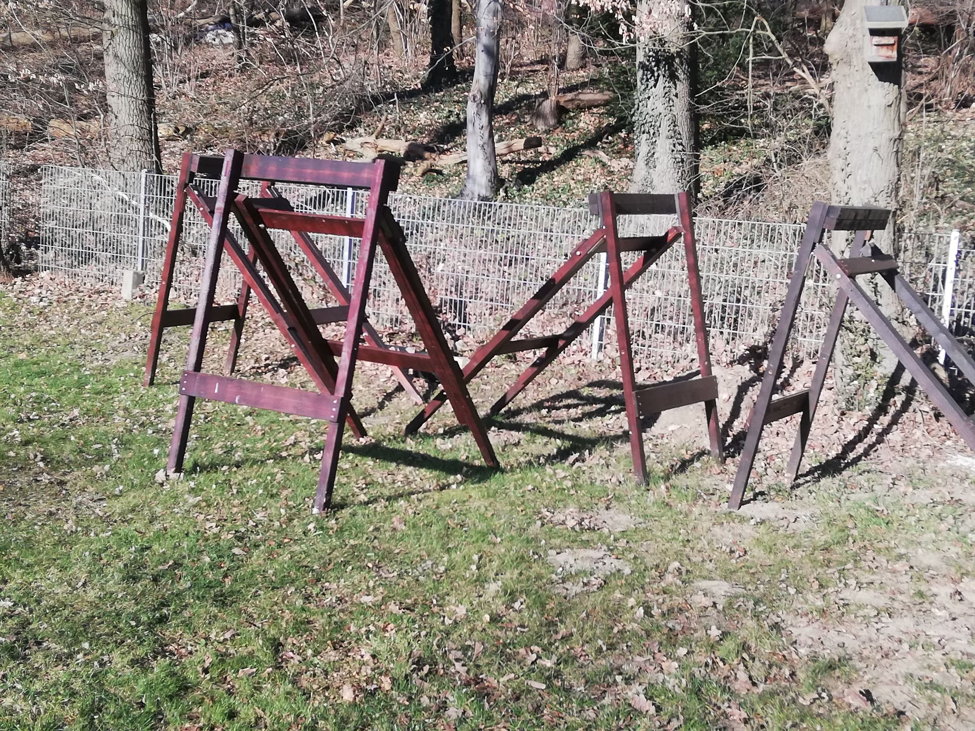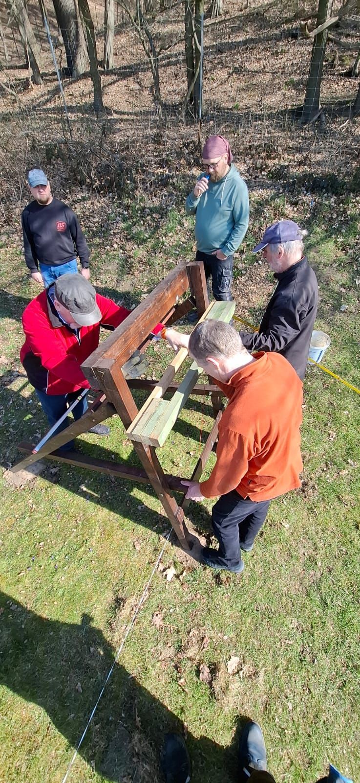 Nun brachten alle Bogensportler, die überholten und gestrichenen Scheibenständer sowie die Scheiben auf die jeweiligen Wettkampf Distanzen, wo die Scheiben auf die Scheibenständer gehoben und gegen Herunterfallen gesichert wurden. Diese schwere und schweißtreibende Arbeit war schnell erledigt und hatten sich einen ausgiebigen Imbiss, den Heike spendierte, auf dem Bogengelände verdient.