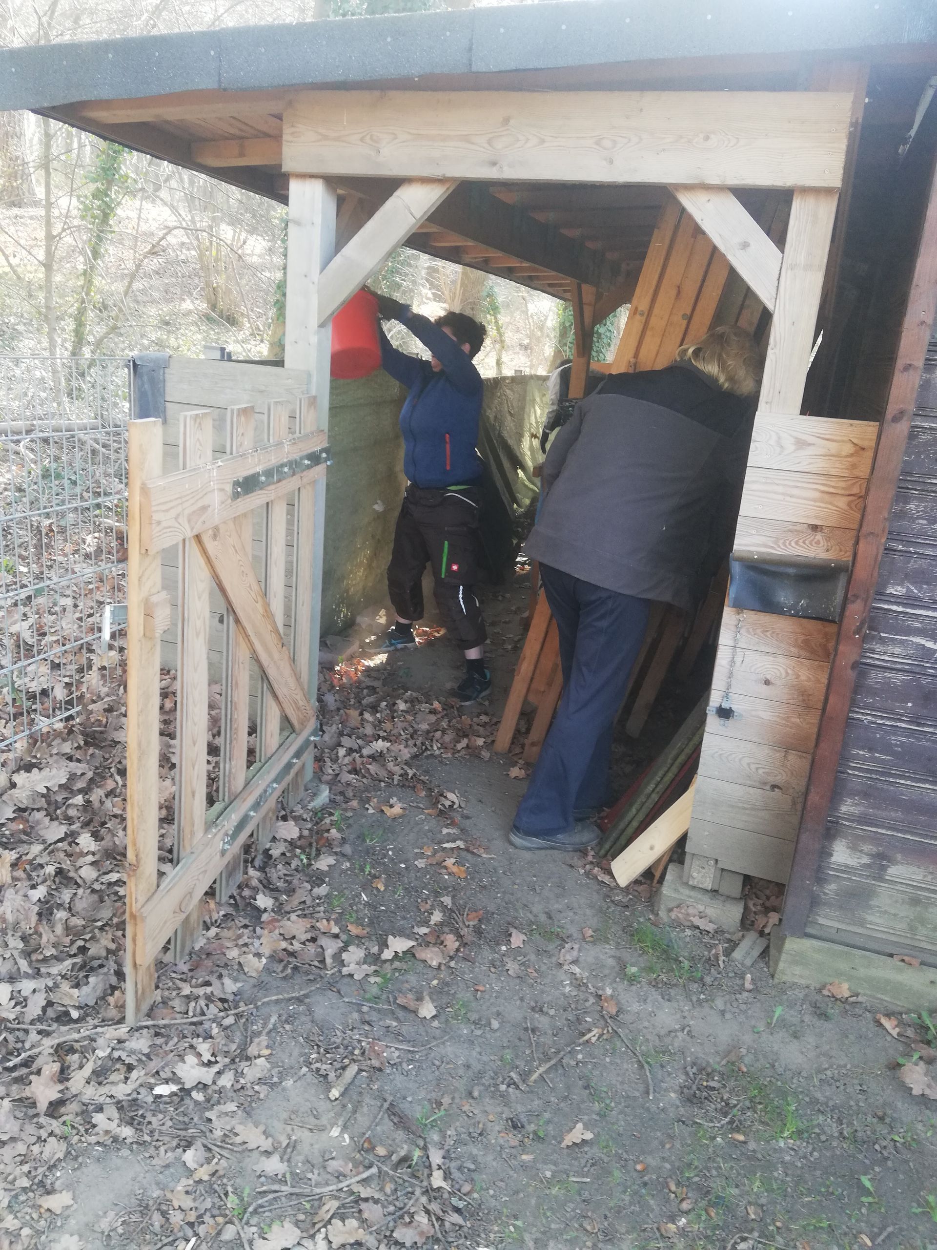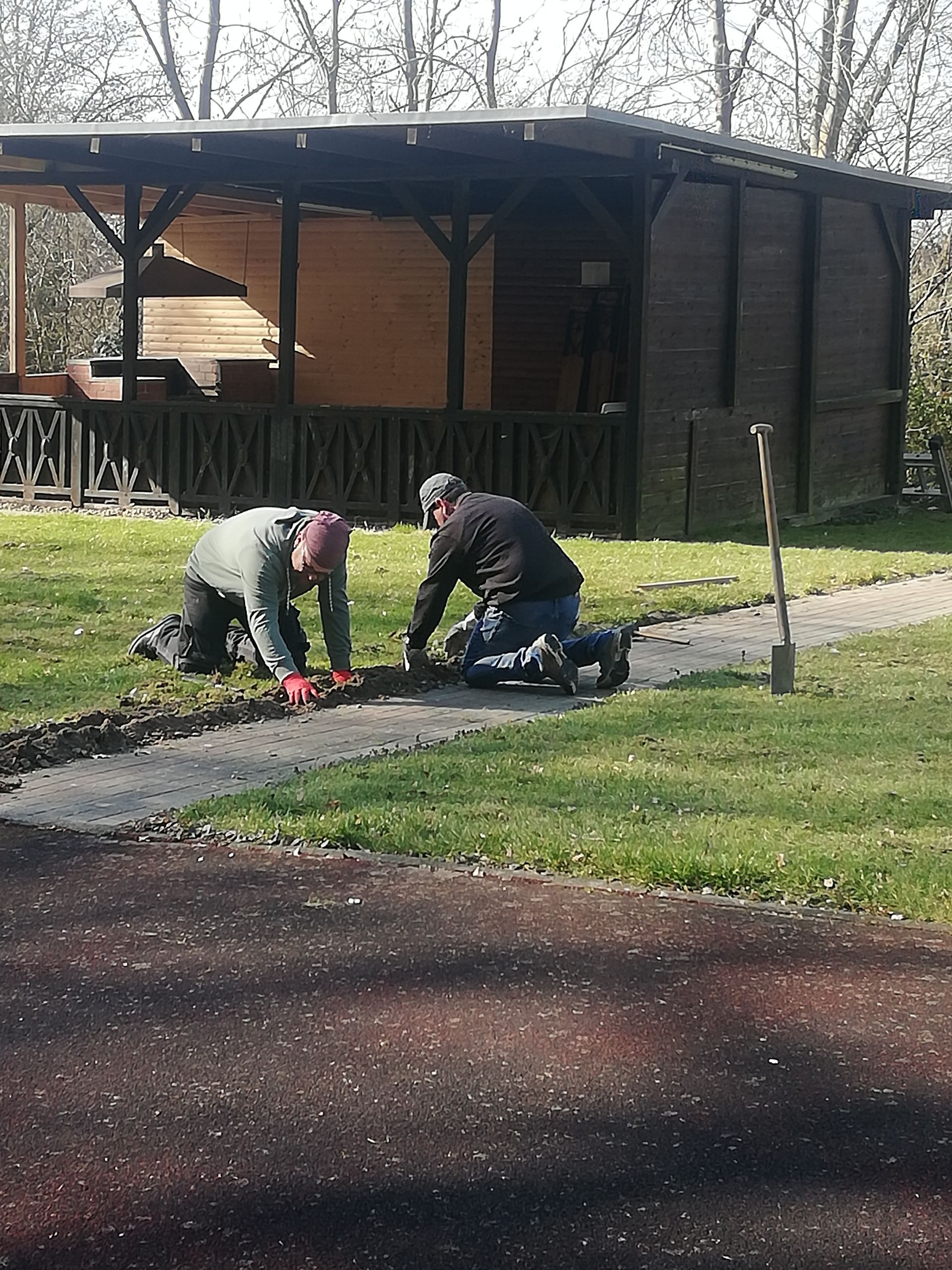 Klaus teilte die einzelnen Arbeitsgruppen ein und pendelte dann von einer zur nächsten Gruppe um die Arbeiten zu organisieren. Roman und Patrick befestigten weiter die Ränder der Schießlinie, um das Durchwachsen vom Gras zu verhindern. Heike, Madlen und Hannah reinigten den Unterstand, in dem unsere nicht genutzten Scheiben und -ständer lagern, vom Laub, dass sich im Laufe der Jahre dort eingenistet hatte. Madlen und Heike sorgten auch für den Einkauf der Lebensmittel zur Stärkung der Truppe.