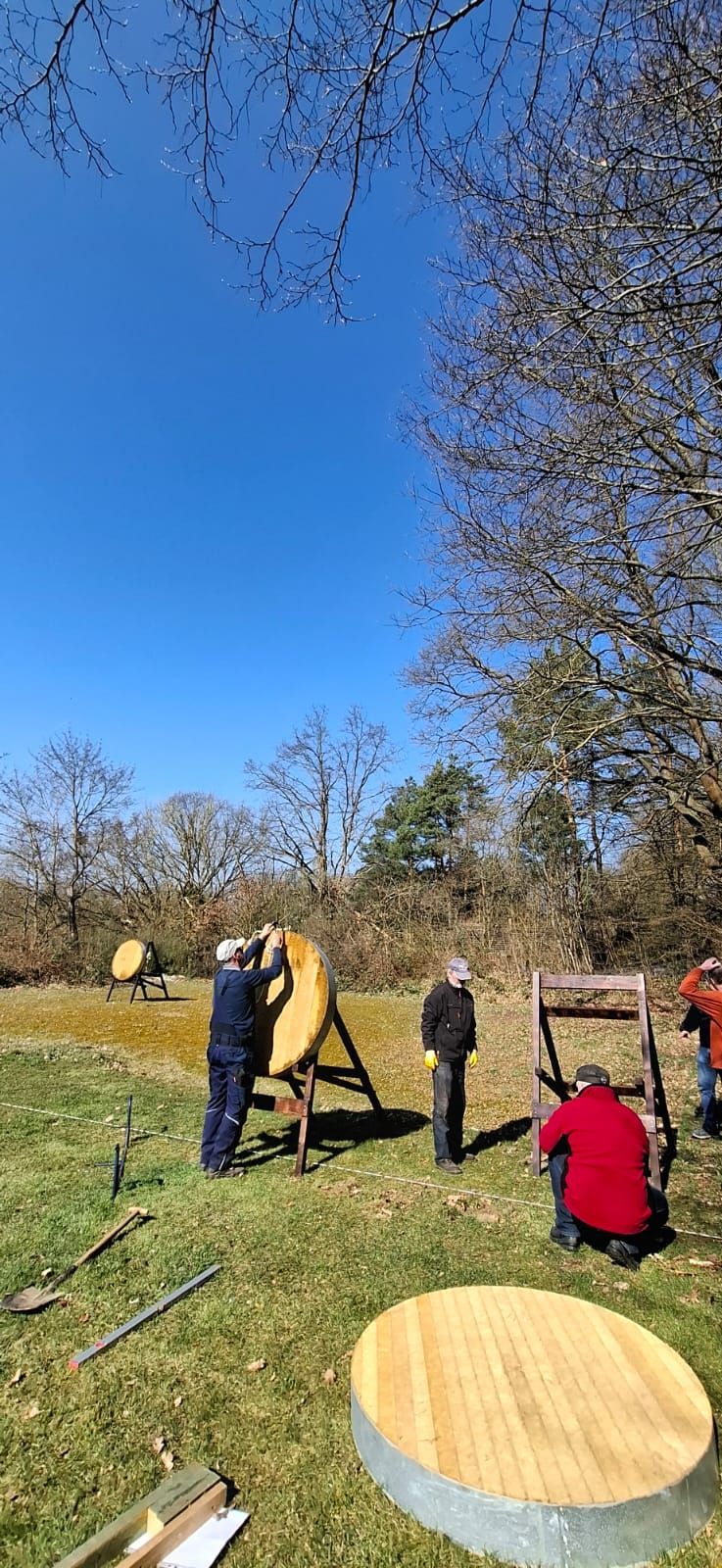 Frank, Norbert, Emil u. Matthias richteten alle Fundamente der Scheibenständer passend zu den Entfernungen aus und brachten sie Steine in die Waagerechte, um die richtige Scheibenneigung und zulässige Toleranz in der Entfernung zu erreichen.