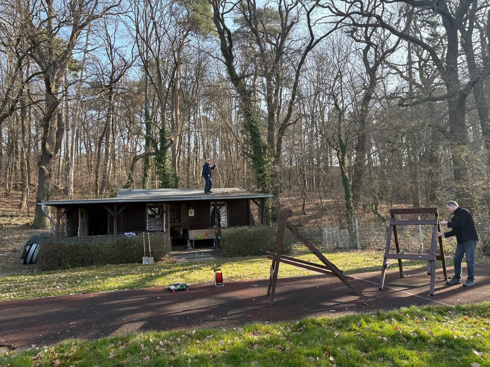 Frühzeitig trafen sieben Bogensportler auf dem Gelände ein und begannen mit der Arbeit. Klaus übernahm die „Oberaufsicht“, stieg dazu auf das zu reinigende Hüttendach und dessen Dachrinne. Madlen trug die Maulwurfshügel ab und brachte das Erdreich auf einem großen Hügel. Dies Erdreich nutzen Patrick und Roman für die Herrichtung der abgesackten Schießlinie, die bereits von Heike und Norbert vom Unkraut der letzten sechs Monate befreit war. Während Heike für den gemeinsamen Imbiss einkaufte, säuberte Norbert die Grillhütte, welche seit einiger Zeit „unbetreut und beaufsichtigt“ ihr Dasein fristet. Matthias hatte mittlerweile die erste Hälfte der Scheibenständer aufgebaut, die Schrauben wieder gängig gemacht und erste Schäden repariert. Zur moralischen Unterstützung waren Uschi und Werner erschienen und sorgten für zusätzliche Motivation.