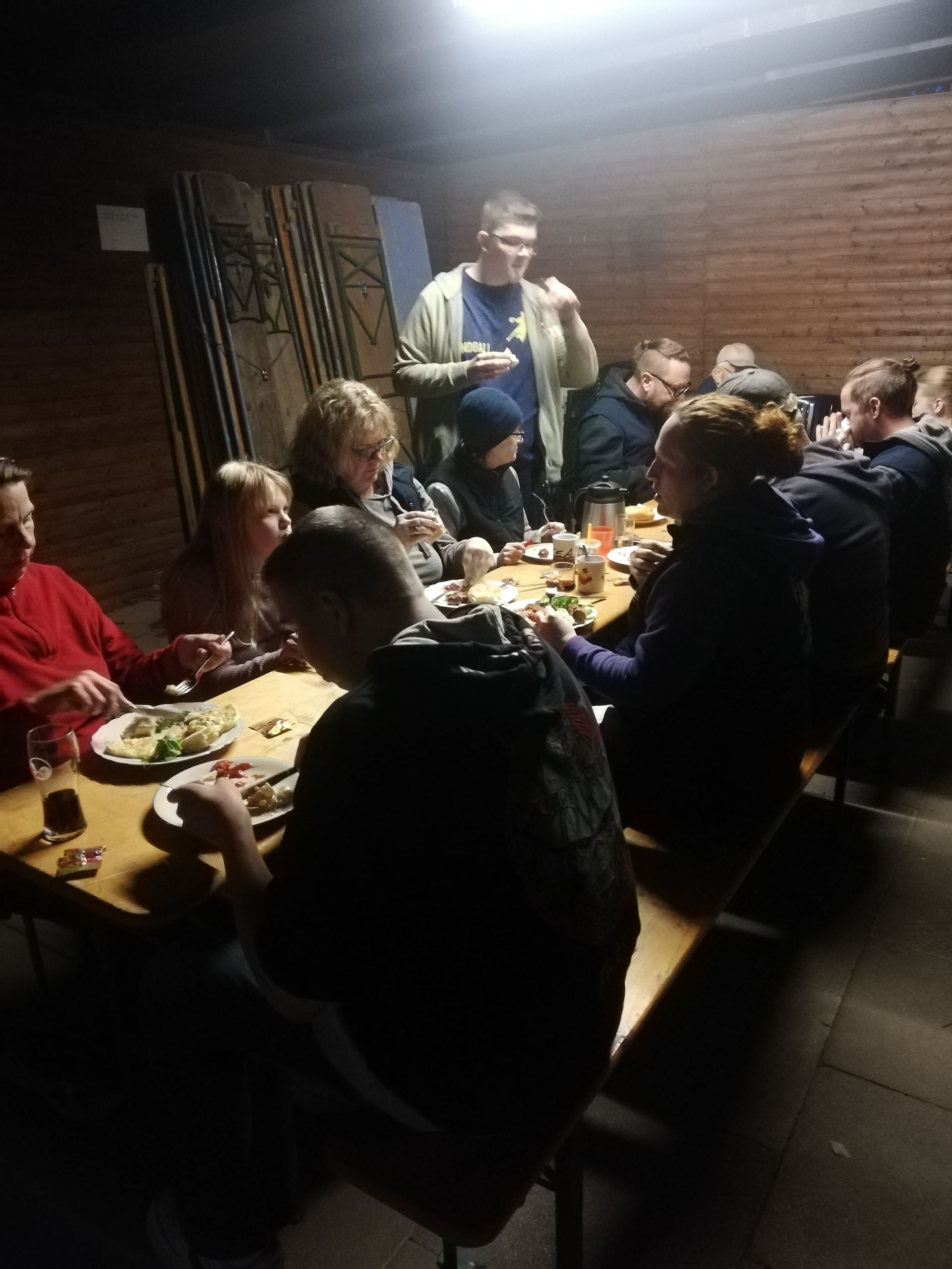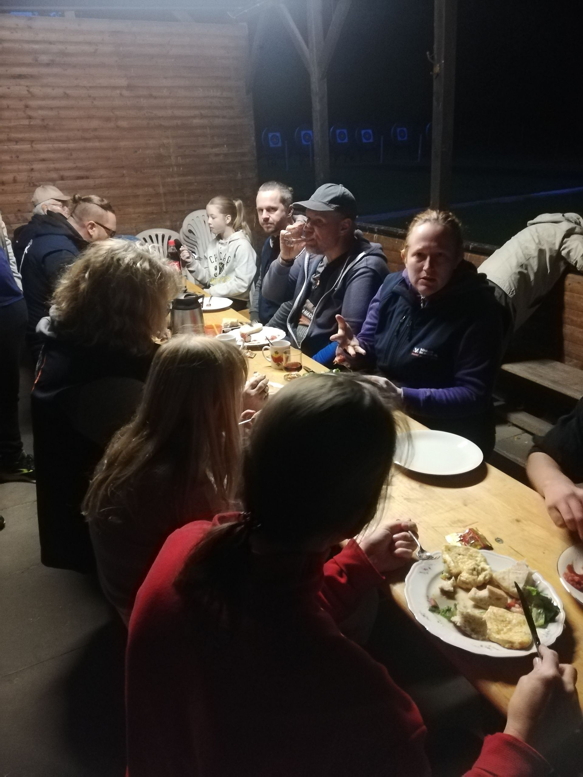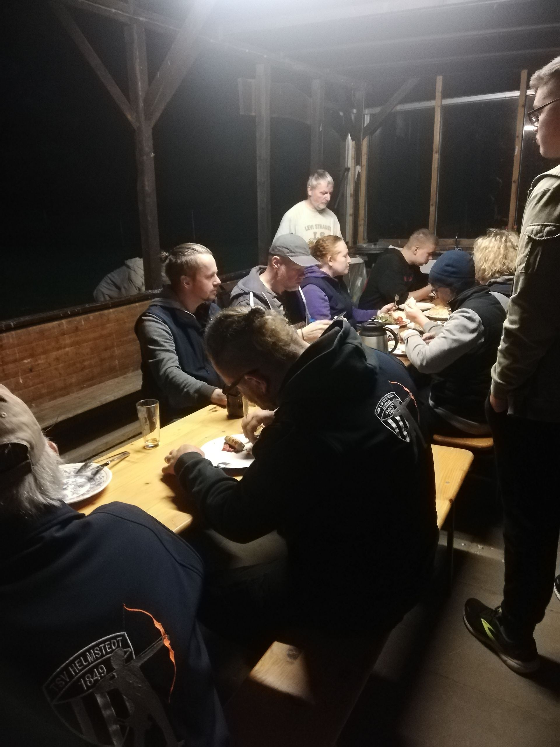 Nun hatten sich die Sportler eine Stärkung verdient. Der Grill hatte Betriebstemperatur, die Bratwürstchen waren fertig gegrillt und diverse Salate und Beilagen standen bereit. Mit großem Appetit stürzten sich alle auf das Essen. Einige Leckereien nach dem Essen, waren natürlich auch vorhanden, bevor es einem regen Gedankenaustausch nun in schummriger Beleuchtung das nächste Spiel zu absolvieren. Nachdem 2er-Teams ausgelost waren, schossen je ein Schütze der Teams einen Pfeil auf die schwach beleuchteten Scheibe. Aufgabe für den zweiten Schützen der Teams war es, dieselbe Ringzahl zu treffen, wie der erste Schütze des Teams. Bei Tageslicht schon keine leichte Übung, um so schwieriger bei der geringen Beleuchtung. Wenn dieselbe Ringzahl getroffen war, durfte sich das Team die doppelte Ringzahl aufschreiben, wenn nicht dann nichts. Nach zwölf Durchgängen und Addition der Ringzahl waren Hannah und Werner die Sieger. Den zweiten Platz belegten Kerstin und Norbert und den dritten Platz Helena und Sven.